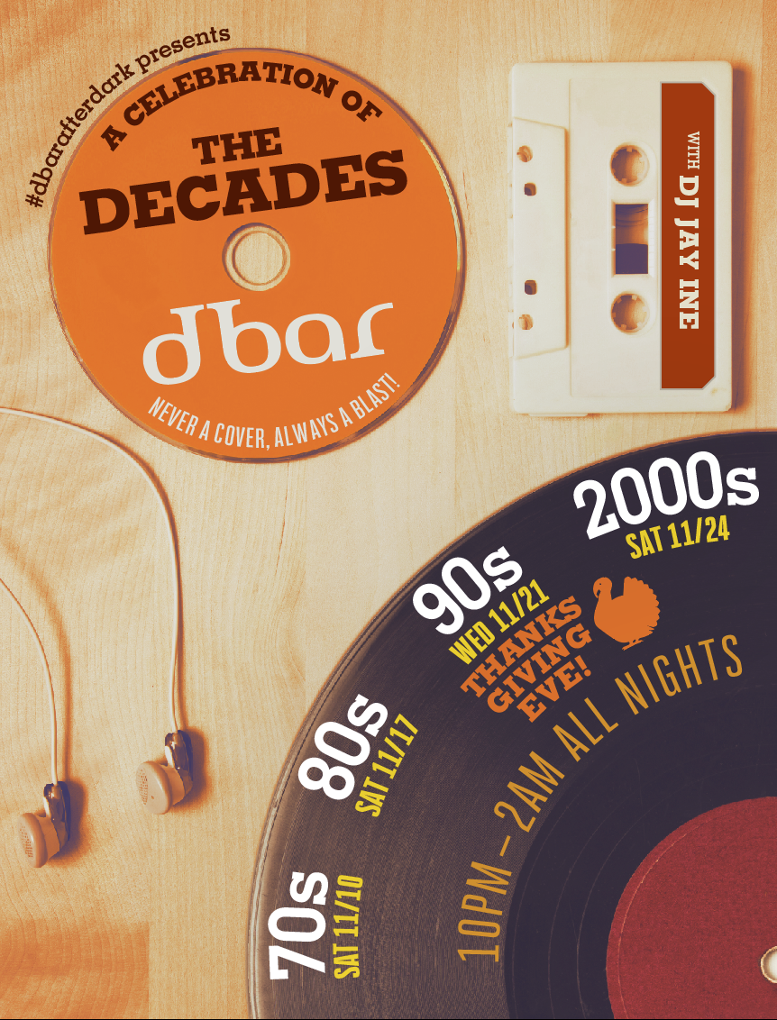 The Decades Dance Party features the music of the 1980s Can you feel the retro vibe? 80s music will be playing all night at dbar with DJ Jay Ine, on Saturday startinga at 10PM in Dorchester