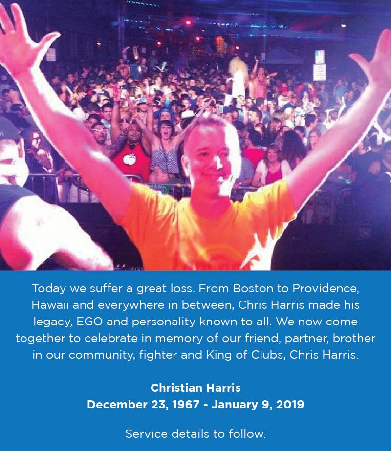Rhode Island native Chris Harris, passed away peacefully at home surrounded by family and close friends earlier this week on Wednesday, January 9, 2019.