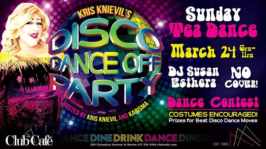 Kris Knieval’s Disco Dance Off Party DJ Susan Ethera will be playing all of Kris’ favorite music to celebrate her birthday starting at 6PM on Sunday at Club Cafe in Boston