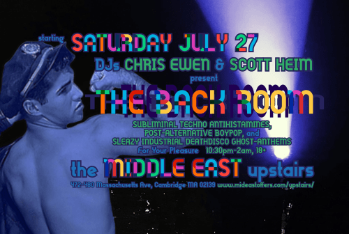 NEW: The BACK ROOM (18+) is upstairs at the Middle East on Saturday with DJs Chris Ewen and Scott Heim – Doors open at 10:30 in Central Square