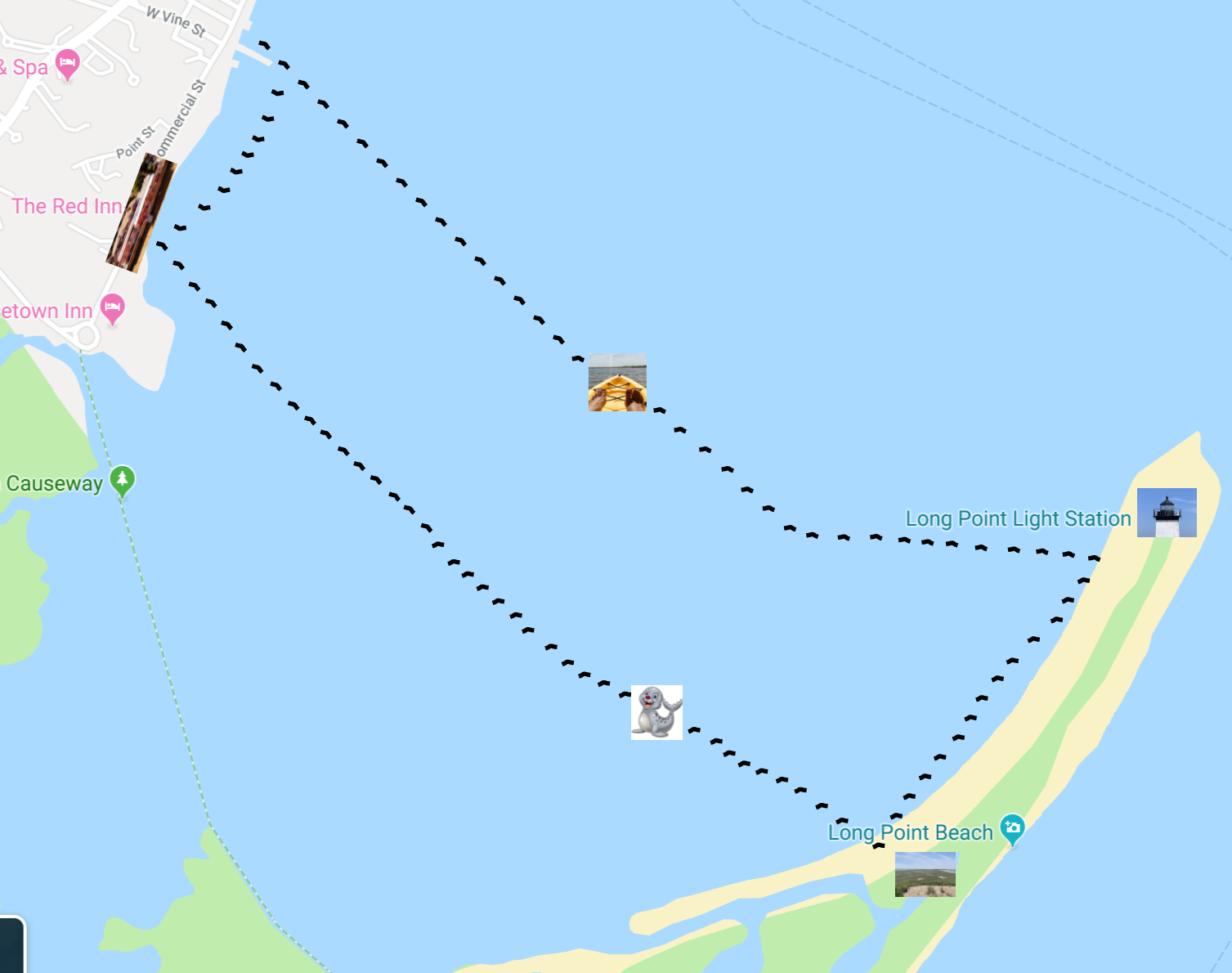 Below is my amateur illustration of the route we took after leaving Flyers Boat Rentals. None of the photographs of the pod of seals came out so I opted for a cuter cartoon caricature to show approximately where they were feeding and sunning themselves, but all the other photos were snapped by me.