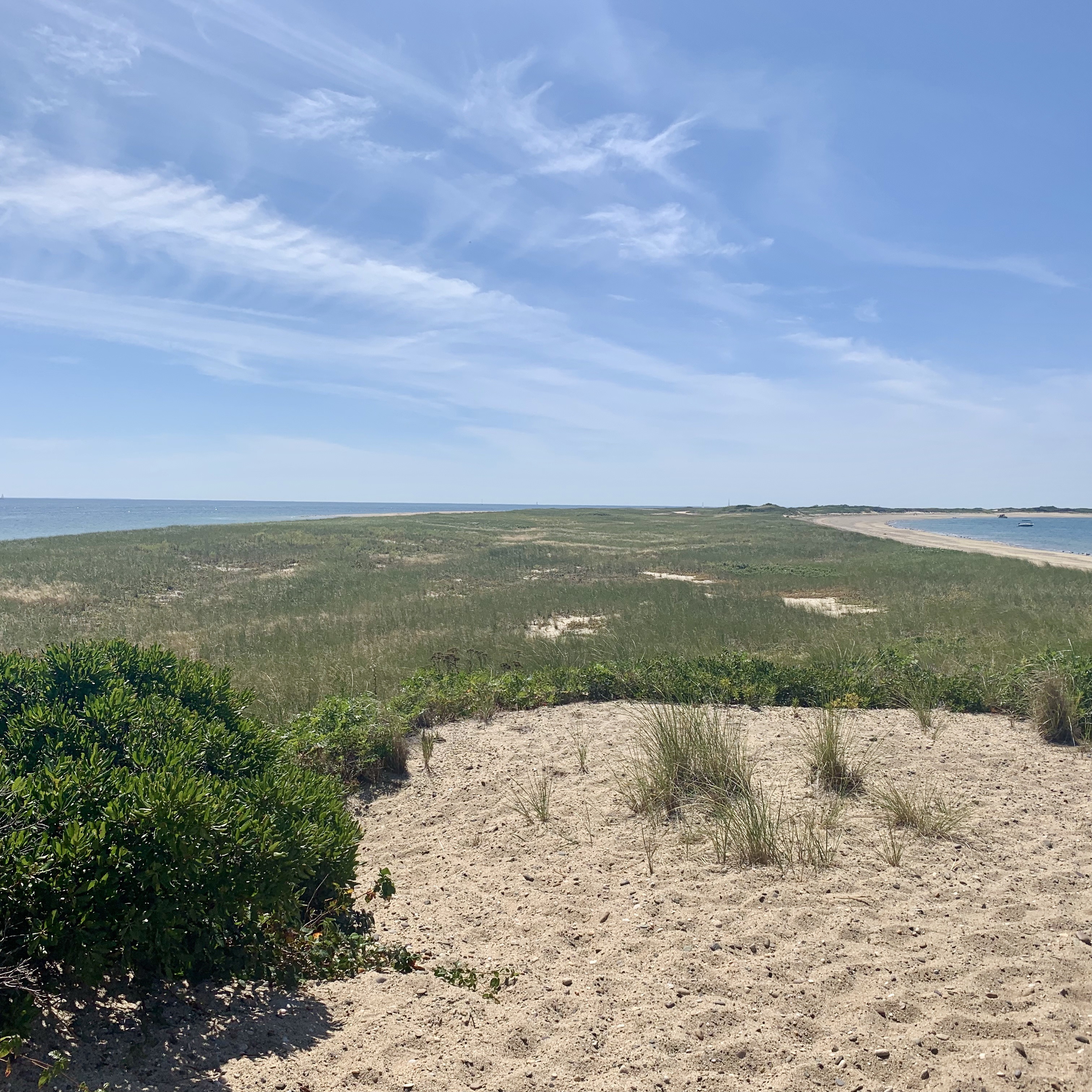 After we pulled our kayaks up on the beach we walked around a bit and took the obligatory selfies in front of Long Point lighthouse which was constructed back in the early 1800s. Neither Ed nor I felt much like sitting still so we put our kayaks back in the water, hugging the coastline and coming to shore so I could snap this photo (see below) which shows how narrow the dunes get: below is a photo of open ocean on the left and Ptown’s sheltered harbor on the right.