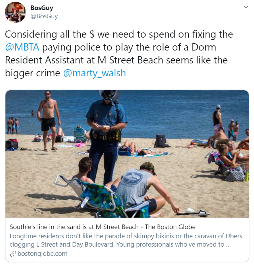 So here’s my sincere ask to Mayor Marty Walsh and Governor Charlie Baker, can we please use these public funds more effectively? In lieu of paying for police to patrol our public beaches, acting like resident assistants in a dormitory, can we use those funds more effectively? I’m sure the MBTA could use the money.