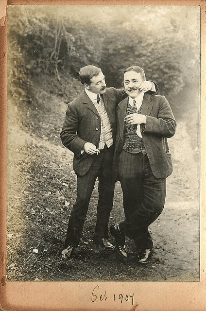 Thanks to the date scrawled at the bottom of this image we know that the photo was taken more than 100 years ago. I’m curious what these two mustached men were planning to do. The one on the left seems quite playful and the one on the right seems to enjoy his friend’s playful touch.
