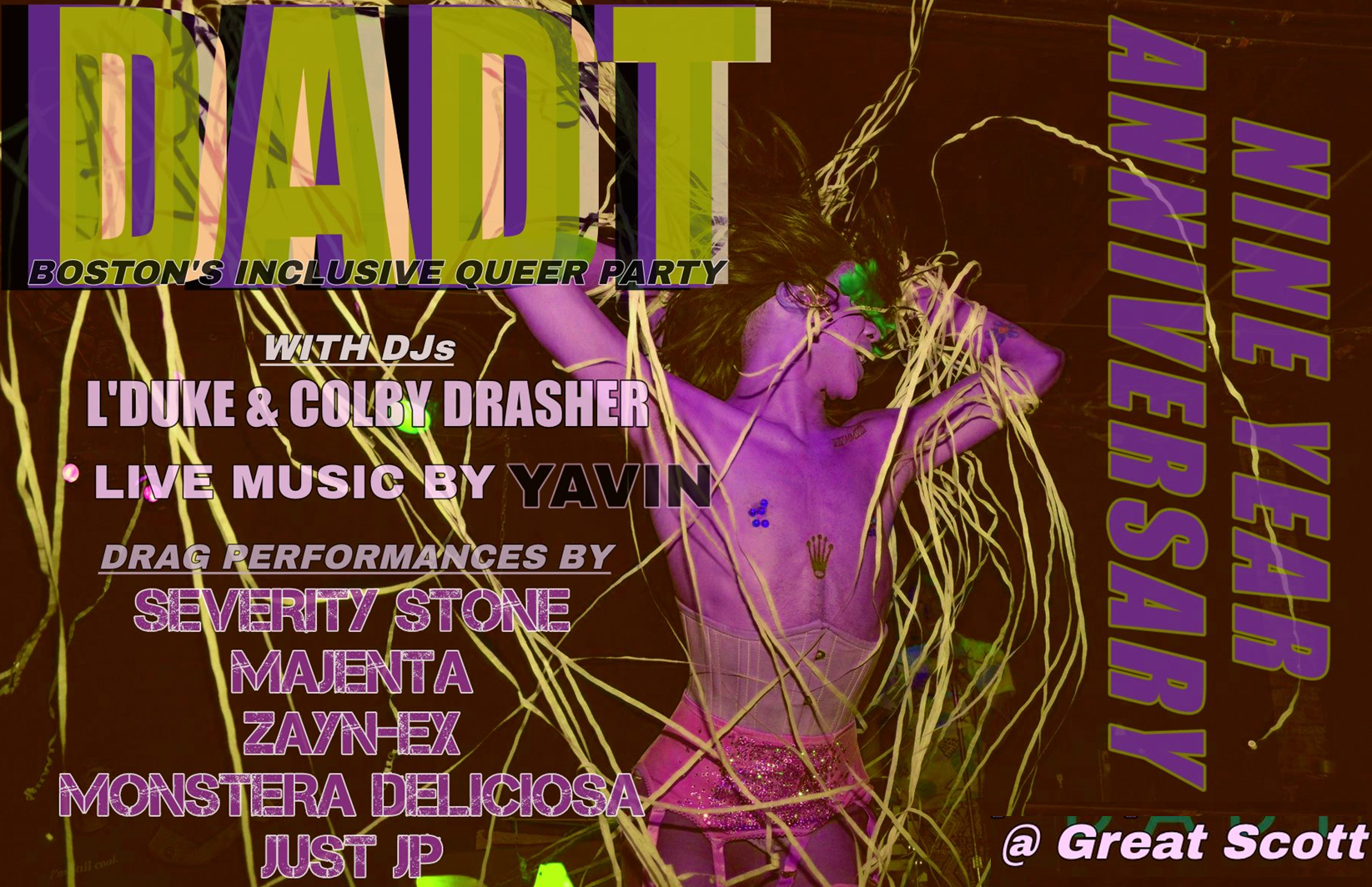 Dont Ask Dont Tell (9th Anniversary Party) will have great music and drag performances this Saturday at Great Scott in Allston – all welcome