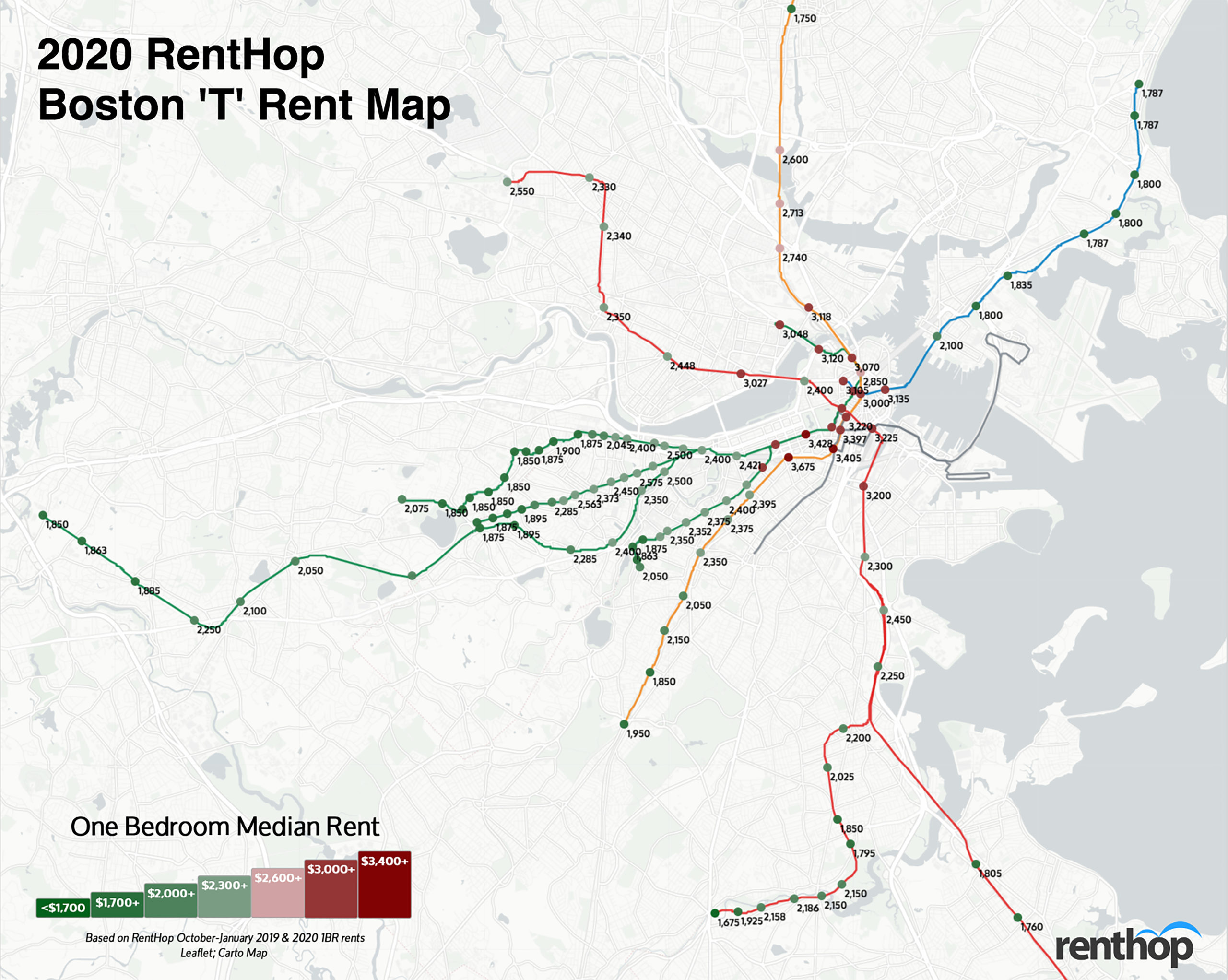 RentHop has shared their annual Boston T Rent Map, which focuses on MBTA subway stations. They have created an interactive version of this map that lets you select individual T stops to show median rents for 1 bedrooms nearby.