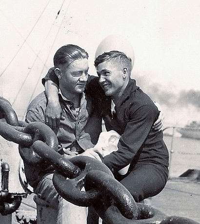 1. The sailor in the dark uniform looks very excited about his friend, much more than his friend certainly. He is a handsome guy