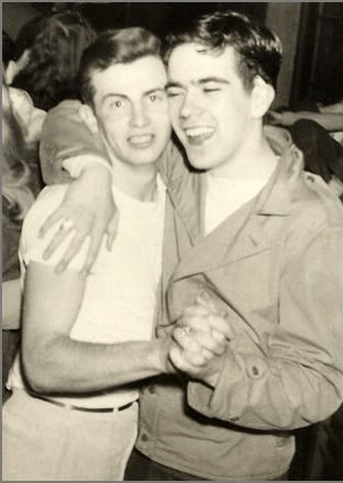Are these two in mid embrace or dancing at a gay sock hop? Who can say for sure but the photo of this cute young gay couple appears to date back to the early 1950s. Anyone else care to take a guess or see any clues in the photo?