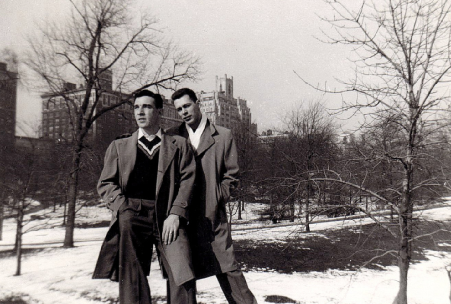 This is one of many photos compiled by The Irreverent Psychologist blog and posted approximately seven years ago, here. The post shares brief stories about the many photographs and according to the blog post, this is a photo of Roger and Frank and was taken in Central Park between 1951 – 1956.