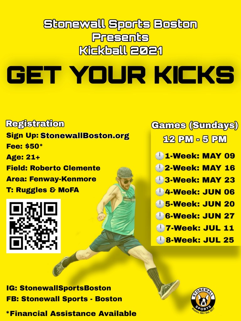Stonewall Sports Summer Kickball season starts May 9 and runs through July 25, 2021. All games are played on Sundays between 12:00 PM – 5:00 PM at Roberto Clemente Field in Fenway / Kenmore near the Ruggles (Orange Line) and MFA (Green Line) T stations.