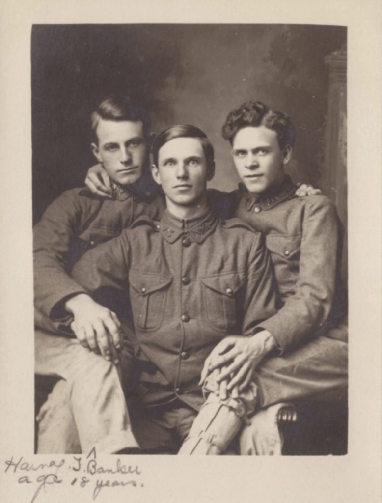 This photo was posted on the Twitter account @oldmasc and I swiped it for this weekly blog post. I can’t tell much about this photo other than that Harvey (on the left) was eighteen years old when the picture was taken. I assume these are military uniforms. Are you able to glean anything from the clothing or hair style that might pinpoint a date or location when these three were photographed?