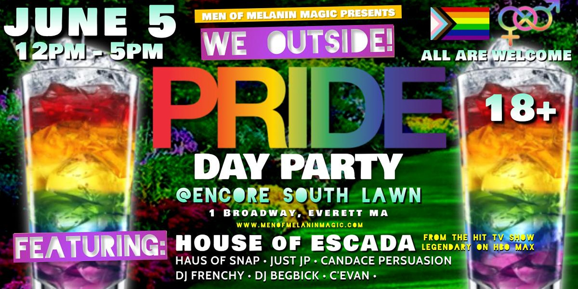 We Outside: Pride Day Party @Encore Boston The Men of Melanin Magic are hosting a 18+ day party on the Encore south lawn on Saturday, June 5 from 12PM – 5PM. Tickets are required and can be purchased here. You can read more about the event here.