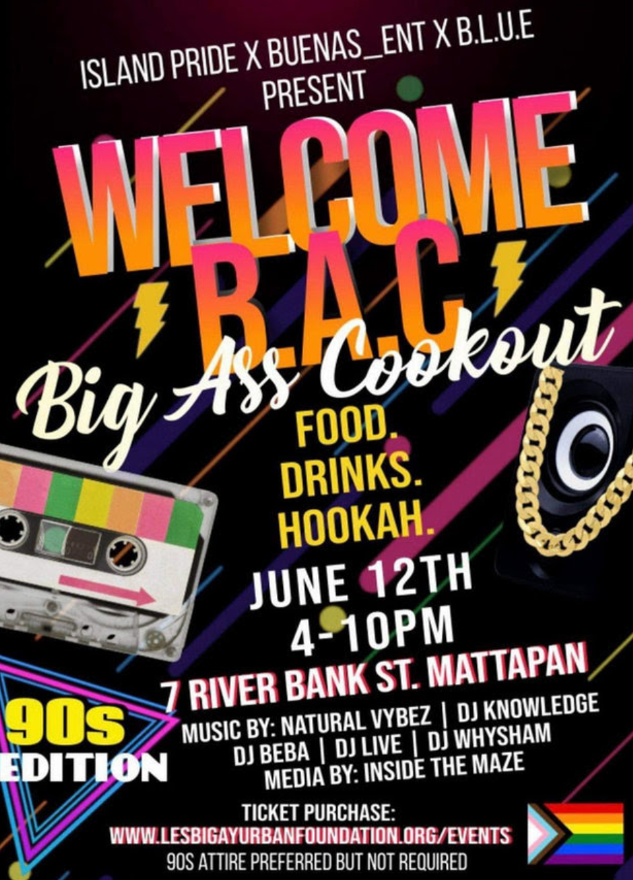 SATURDAY: Big Ass Cookout starts at 4PM in Mattapan. Tickets can be purchased here. For more information about this group visit, Boston’s Lesbian Urban Foundation.
