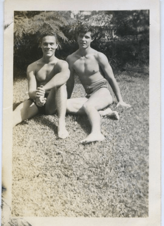 It is not clear when this photo of two friends (maybe more) was taken, but I’ll guess the early 1950s based on what appears to be a higher waist bathing suit being worn by the guy on the right. I love how happy they both look but especially the guy on the left who also happens to have a beautiful smile.