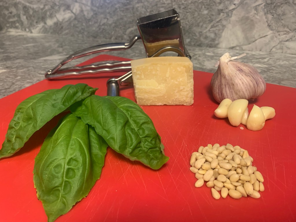The ingredients for a traditional pesto are fairly straightforward. However, I believe that if you want pesto to taste its best you need to use the freshest basil leaves, and grate the cheese you’ll use – don’t buy it grated.