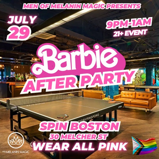 After today’s Barbie Beach Party at M Street Beach (details here), the Men of Melanin Magic will host an “After Party” at Spin Boston in the Fort Point Channel neighborhood.