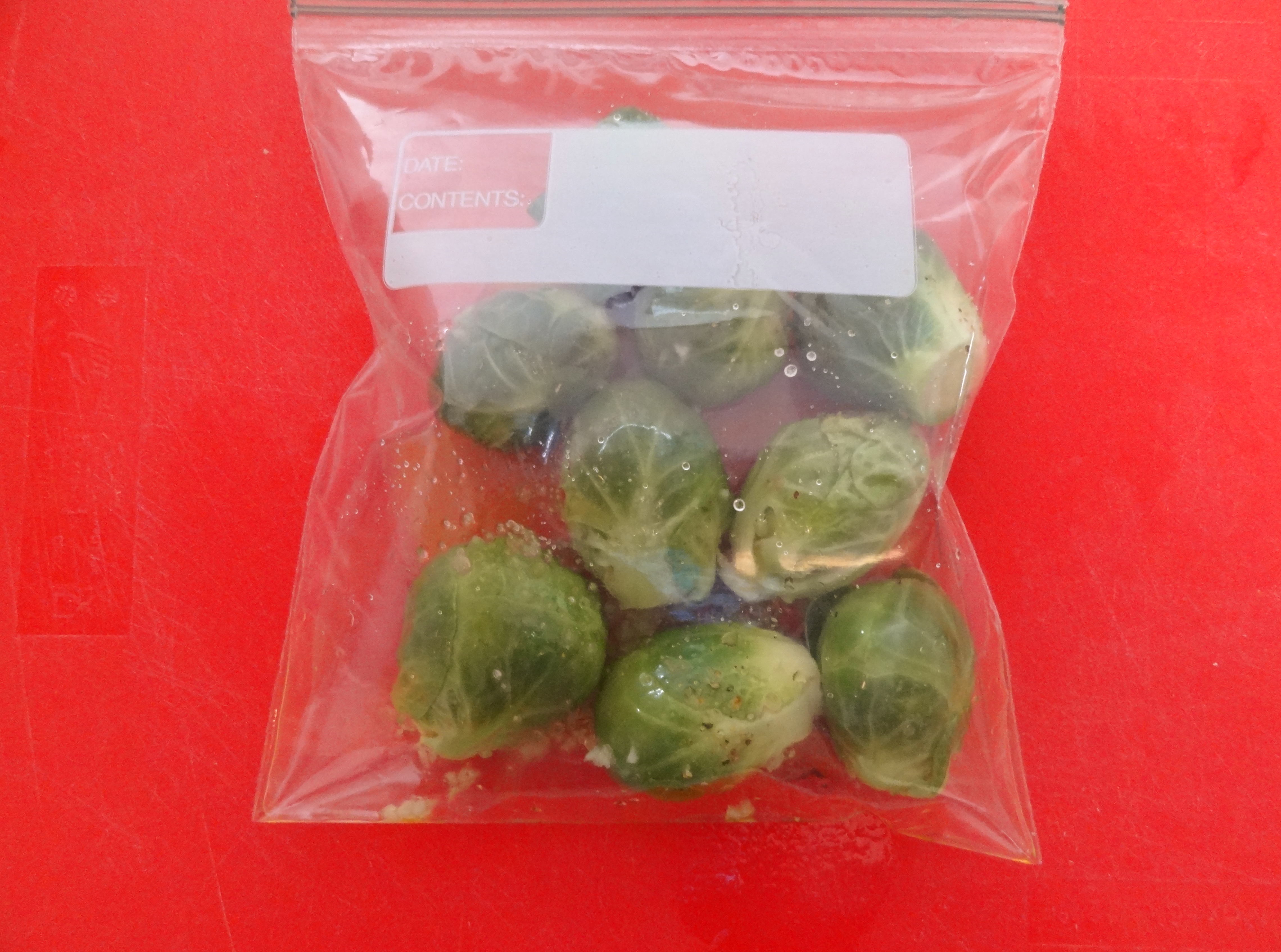Once you’ve added everything in the ziploc bag – give it a thorough shaking. You want the salt, garlic and olive oil to cover / coat the sprouts to add flavor and prevent them from drying out or burning when you roast them in the oven.