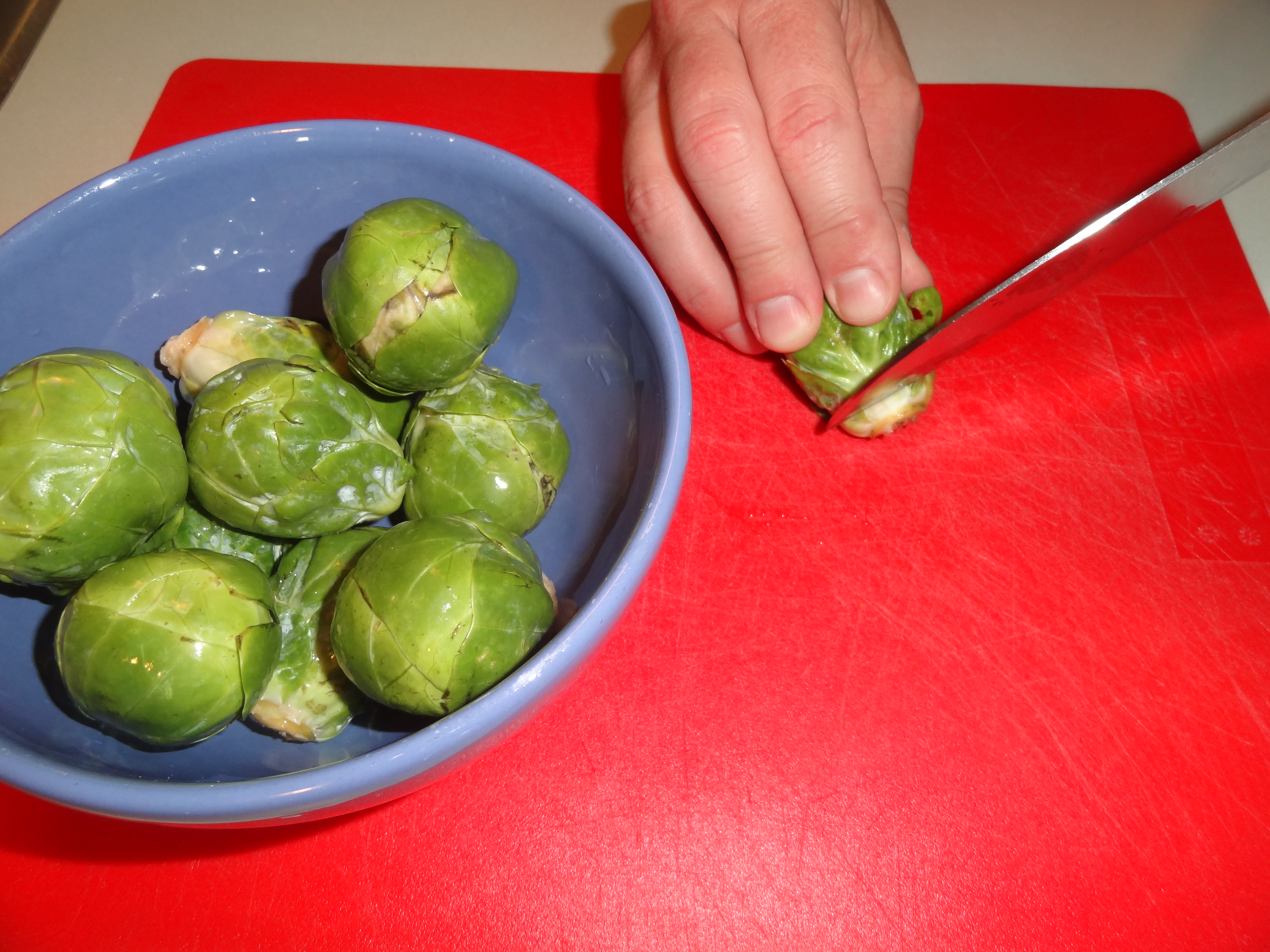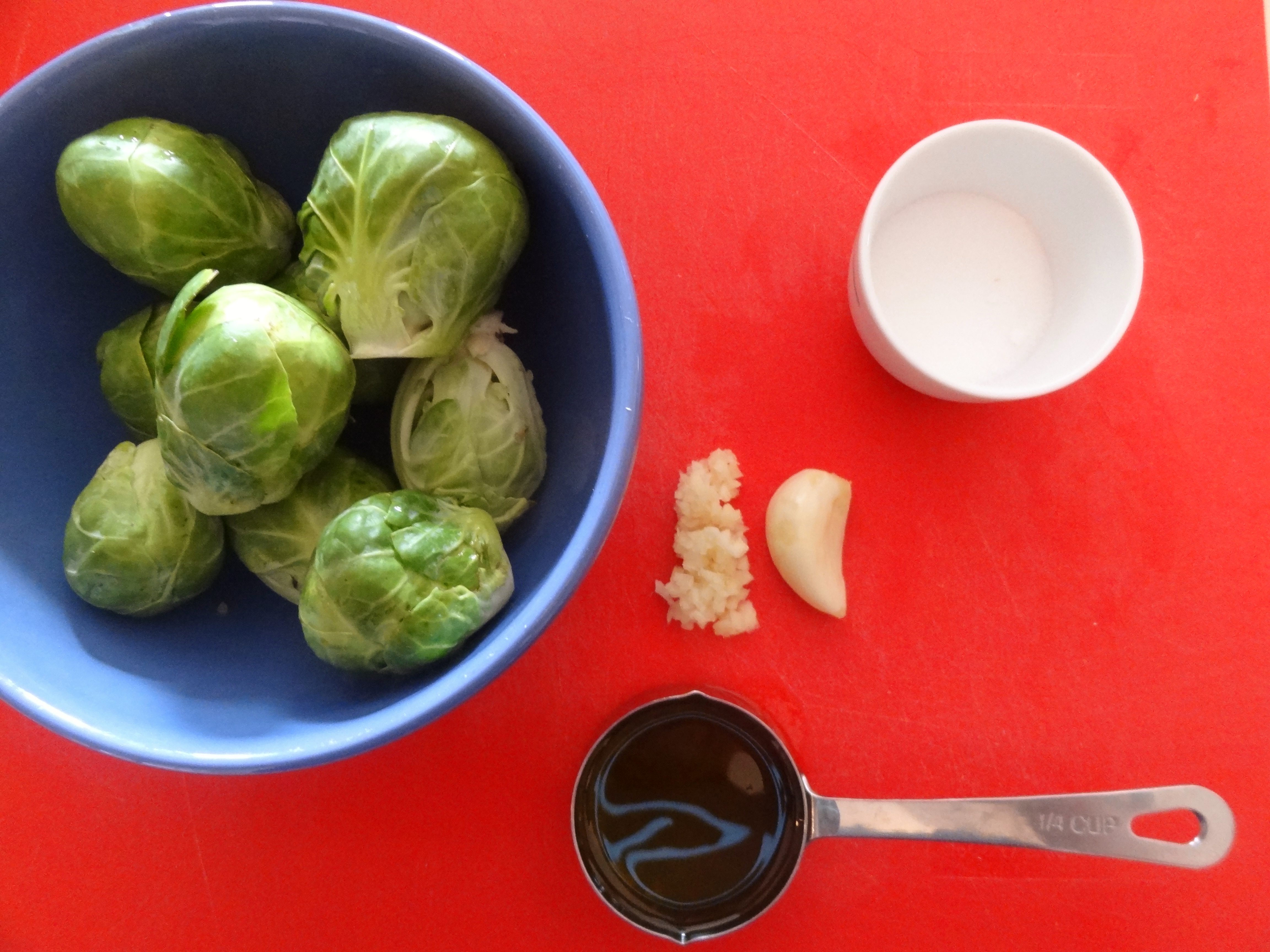 Start by preheating your oven to 400 degrees then soak the sprouts in salted water for a few moments to help remove any dirt. After, chop the stem and remove any discolored outer leaves. Aside from mincing a garlic clove, this is all the food prep required.