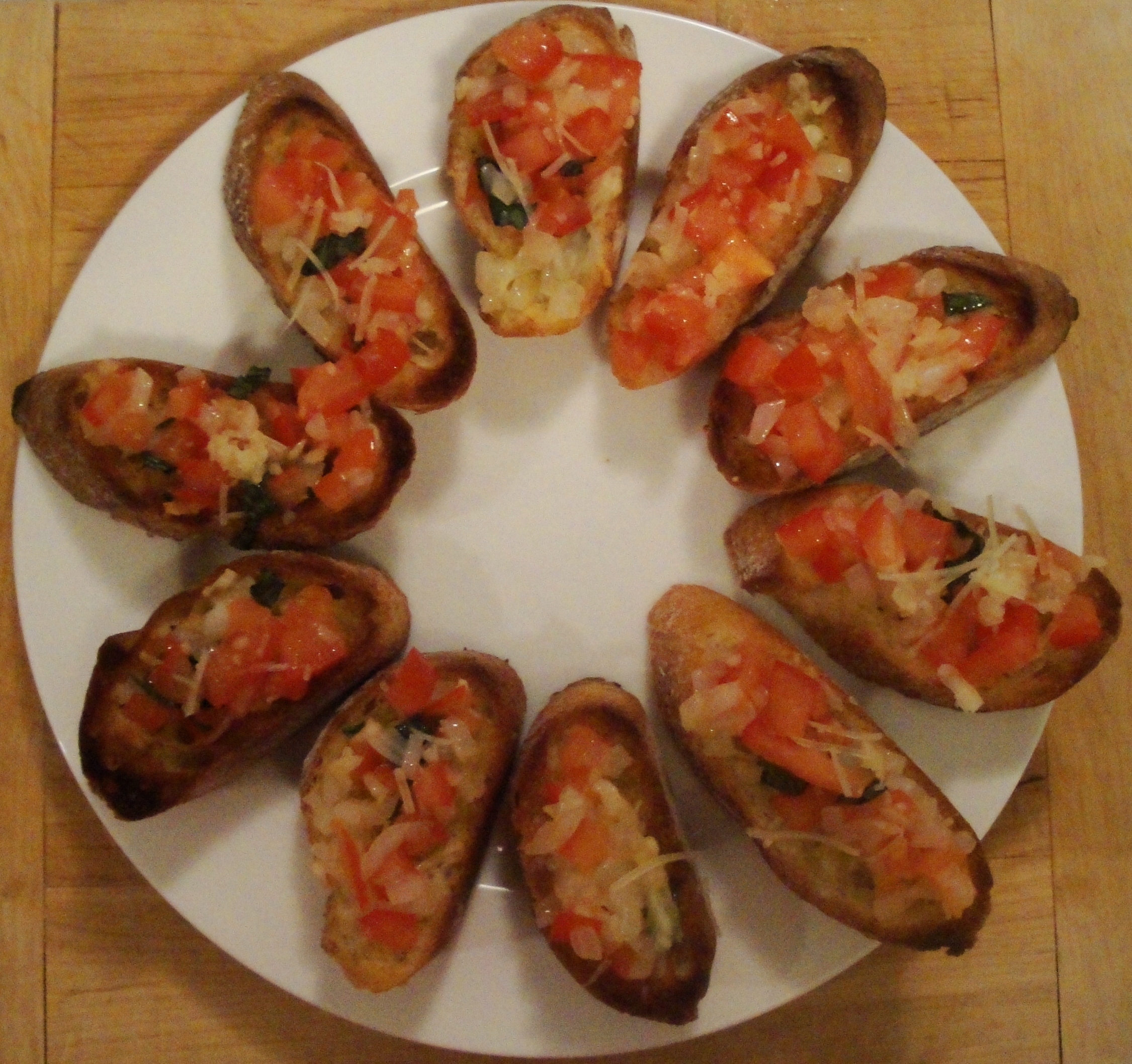 One of my favorite snacks or starters is bruschetta. It is an easy to make antipasto and a staple at any Italian restaurant. Although toppings can vary, generally ingredients include: bread, garlic, onions, tomatoes, cheese, herbs and olive oil, but you can add whatever you like.