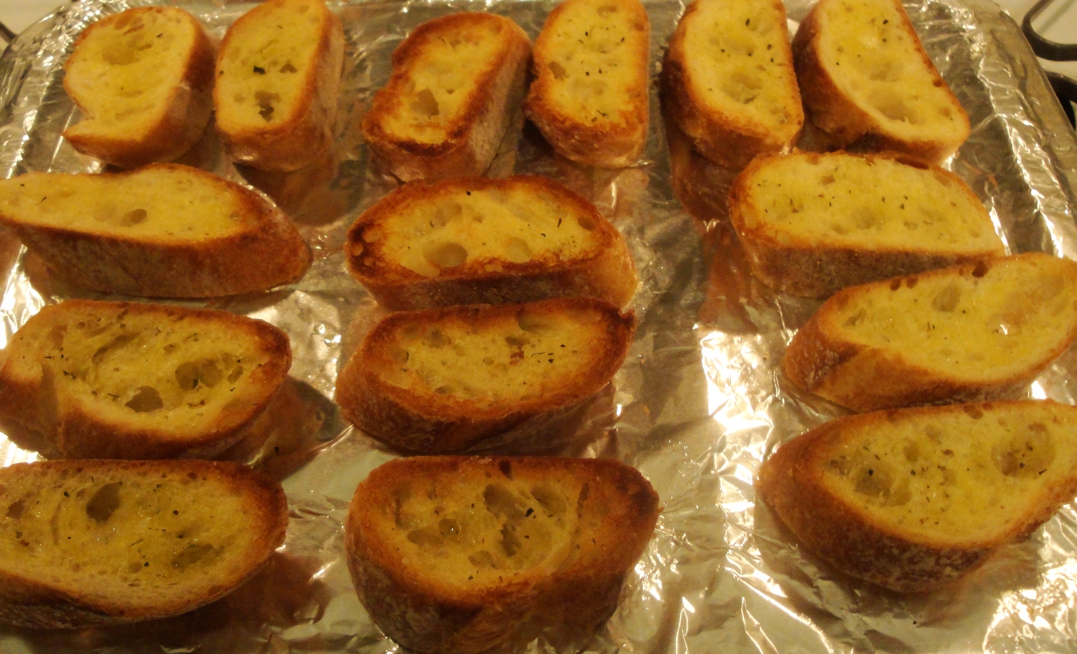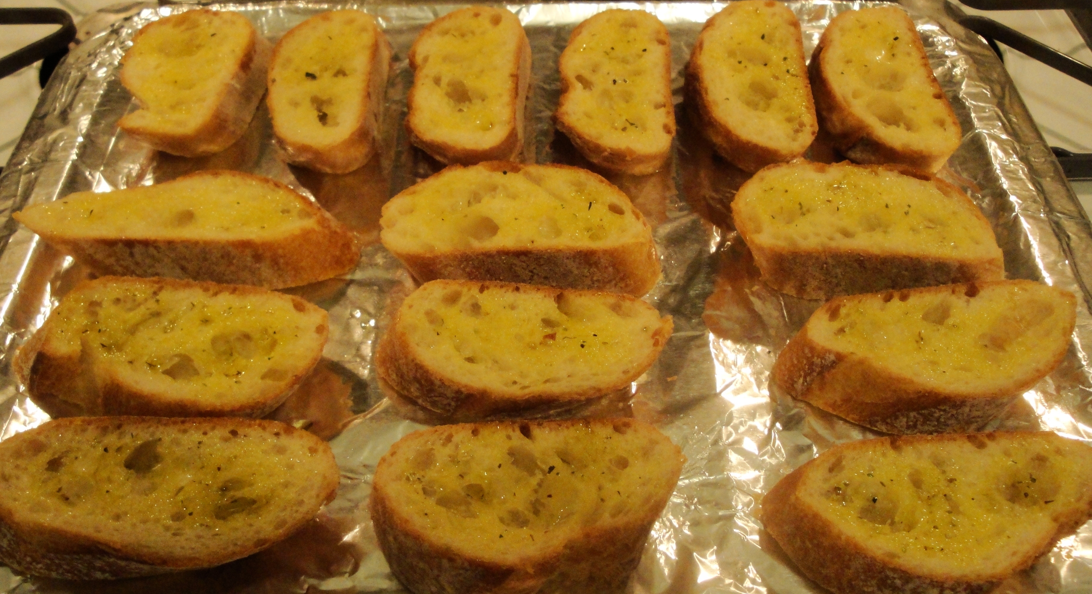 Step 1: Chop the baguette into 3/4 ” to 1″ slices and rub a raw garlic clove over both sides of each slice. In a cup or small bowl mix olive oil, salt and dried Italian herbs and brush onto the baguette slices.