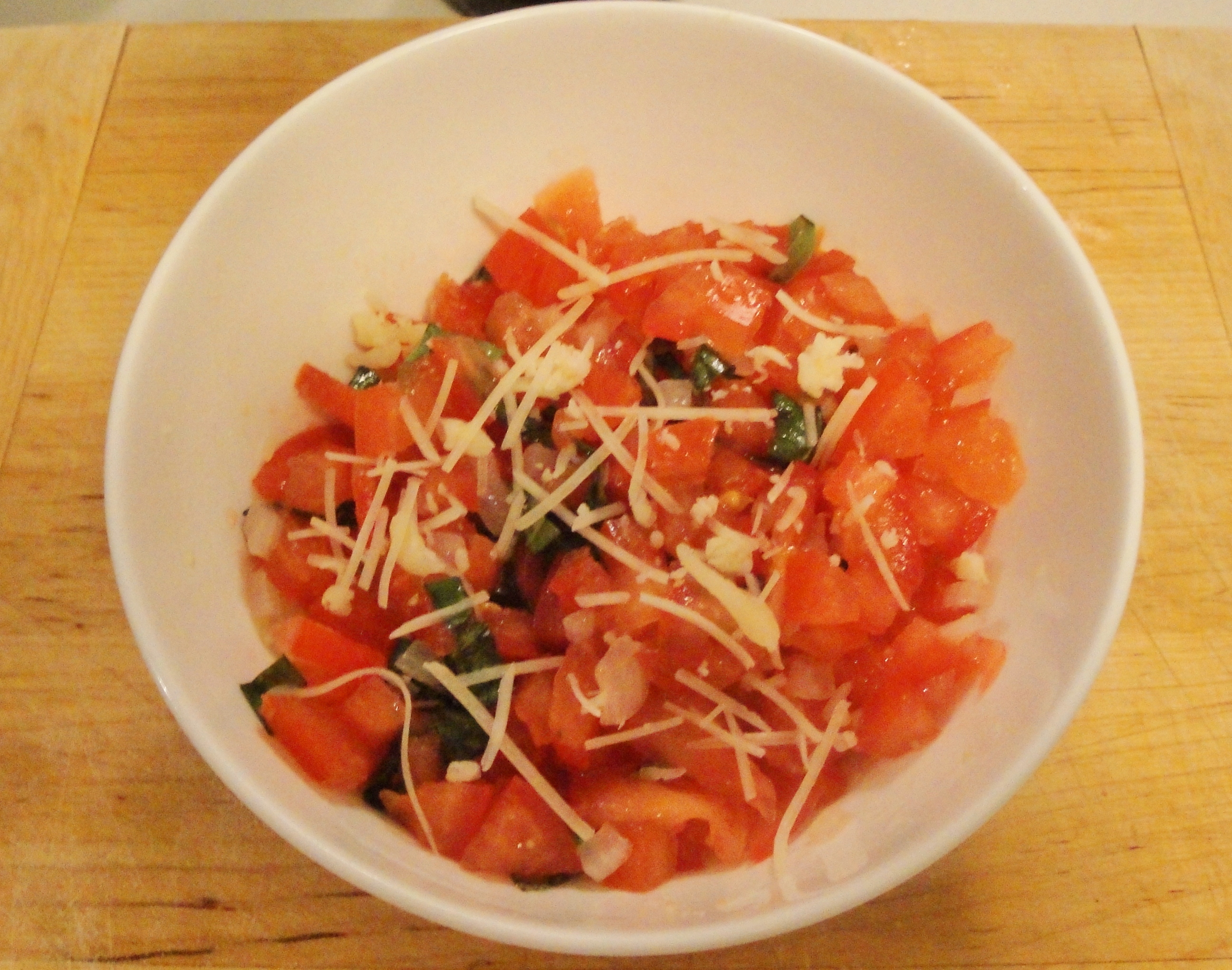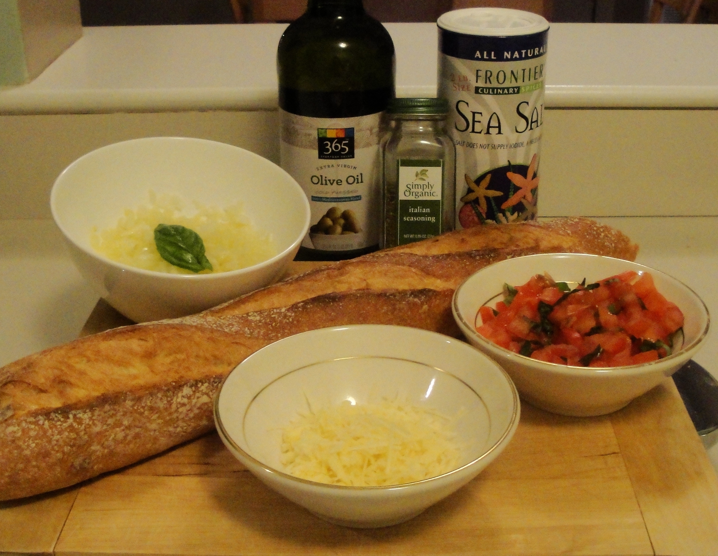Ingredients: 2 cloves of garlic, 1 baguette, 1 tomato, 1/2 vidalia onion, 1/3 cup of shredded cheese (whatever you like and have works) 1/4 cup of chopped basil, olive oil, and salt.