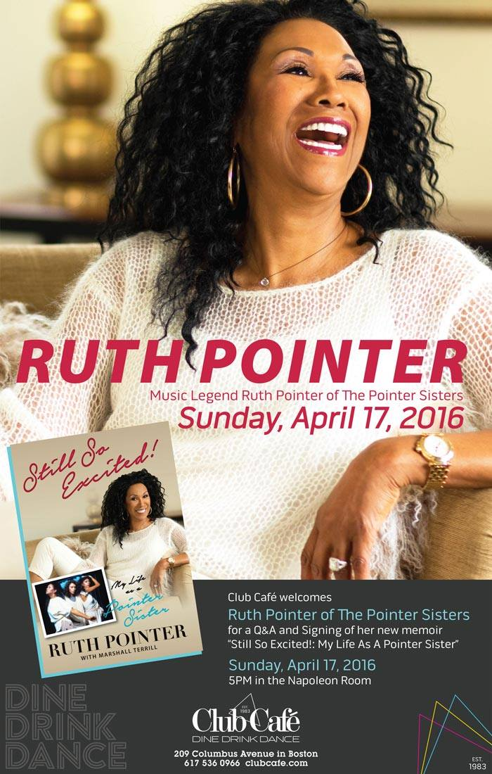 Ruth Pointer of The Pointer Sisters was originally scheduled to visit Club Cafe last month but had to reschedule and will be in Boston tomorrow afternoon at Club Cafe on Sunday, 17th at 5PM for a Q&A and to sign of her new memoir “Still So Excited!: My Life As A Pointer Sister“.