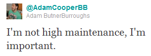 From time to time I read tweets that I feel compelled to share. AdamCooperBB’s tweet from earlier today definitely made me laugh. I hope it brings a smile to your face as well. For the record, I don’t think you’re high maintenance; I think you’re very important. 🙂