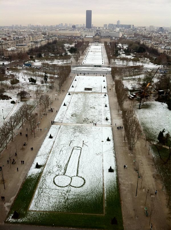I can imagine all sorts of prudish tourists in Paris lining up in the blistering cold to get atop the Eiffel Tower only to have the view of this massive penis.