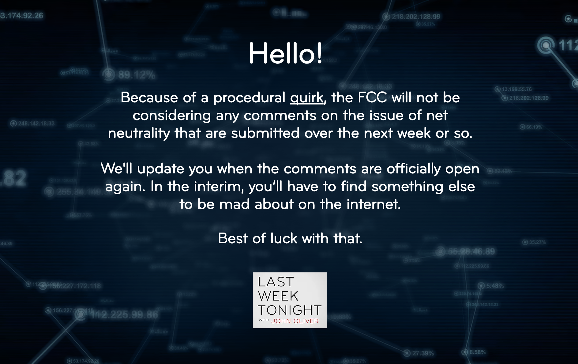 On last week’s show Oliver used his platform again to explain what net neutrality is and why if you happen to be reading this article – it impacts you whether you realize it or not. With his usual wit and zeal, Oliver asked people to visit a website called “GoFCCYourself,” that redirected you to a hidden section of the FCC site where you could comment on the net neutrality proceedings.