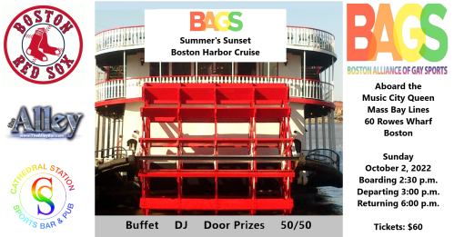 Tickets are still on sale for The Boston Alliance of Gay Sports (BAGS) sunset Boston Harbor Cruise on Sunday, October 2nd.