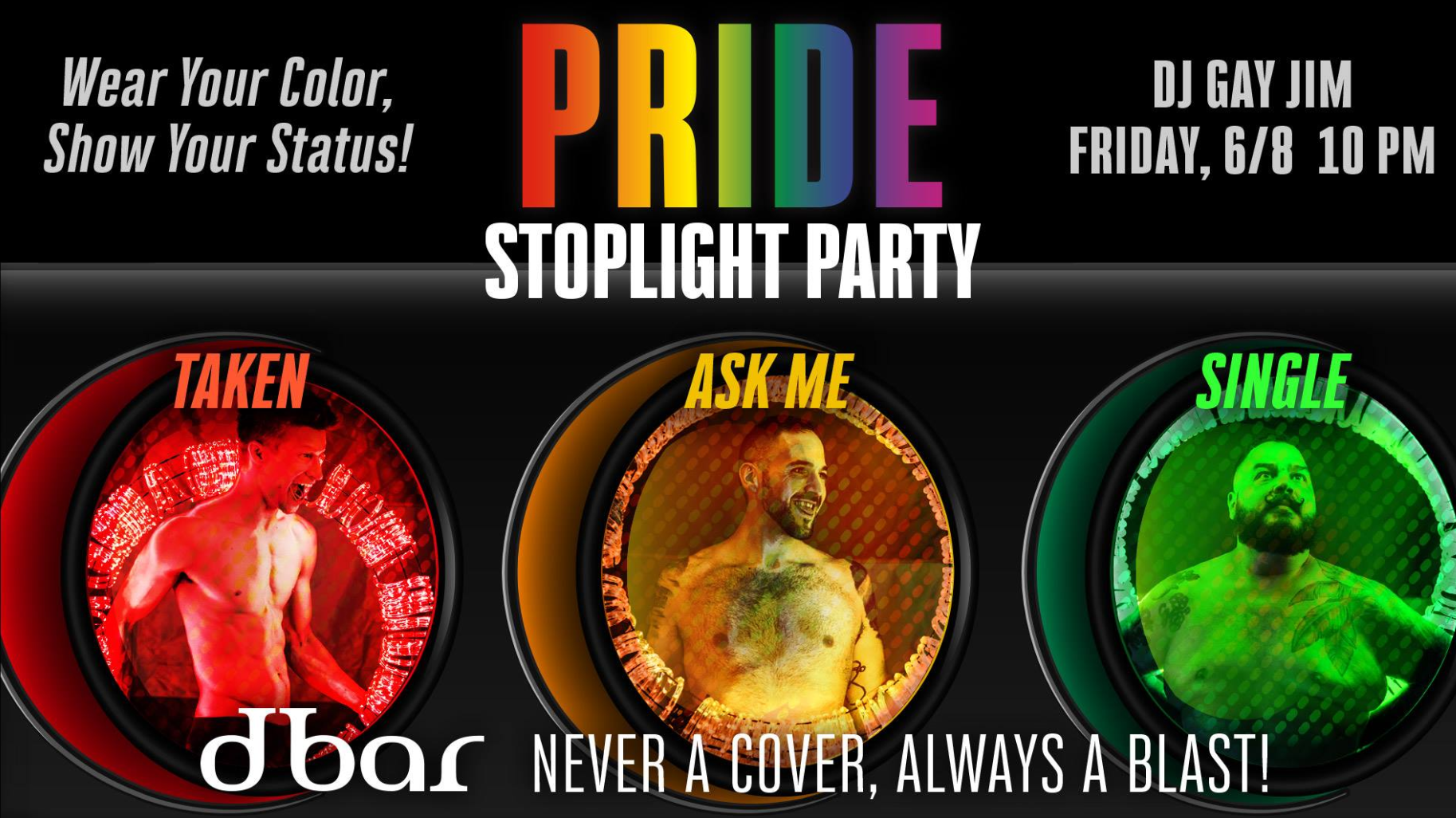 dbar Pride Stop Light Party is always a lot of fun so stop by and be mindful of the color codes: Single – Ask Me – Taken