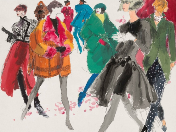 Kenneth Paul Block, Eight female models in fall coats from different French fashion houses, March 4–11, 1991. Source: Condé Nast Archives.
