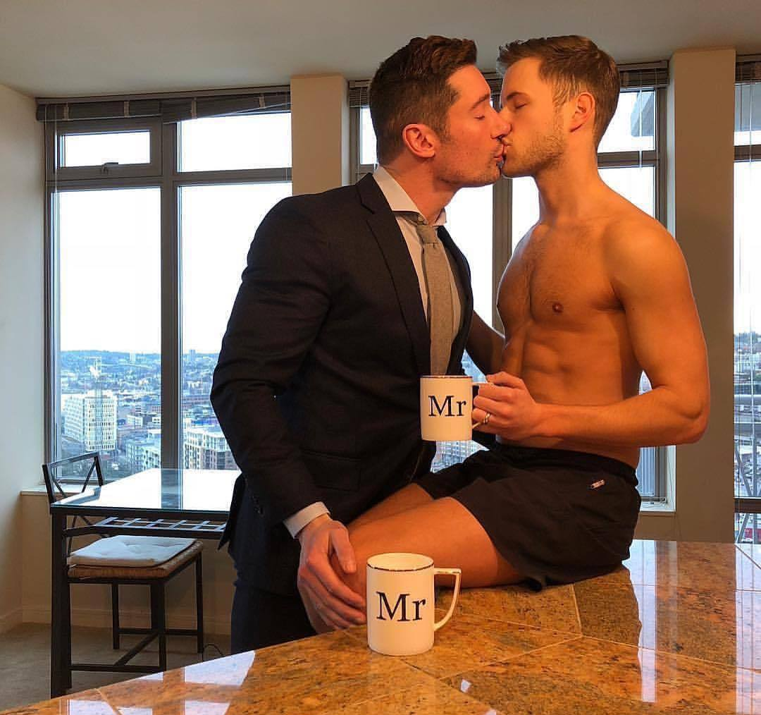Tagged BosGuy, Boston Guy, coffee, gay couple, gay couple kissing, handsome, hunk