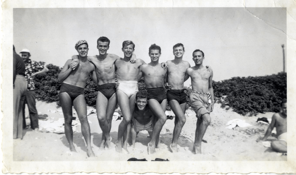 Although all official celebrations in Provincetown were cancelled this year due to COVID-19, this coming weekend would be Holly Folly a LGBTQ+ holiday-themed festival. Since I have Ptown on the brain, I thought I’d share this vintage photo of guys posing on the beach in Provincetown. You can barely makeout the Pilgrim monument in the far right of the photo.