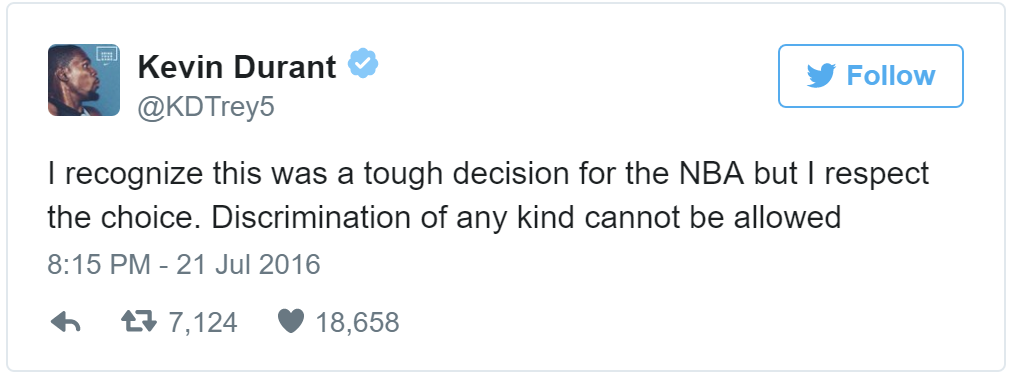 “While we recognize that the NBA cannot choose the law in every city, state, and country in which we do business, we do not believe we can successfully host our All-Star festivities in Charlotte in the climate created by HB2″ -National Basketball League