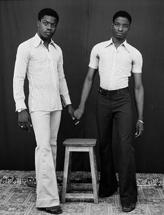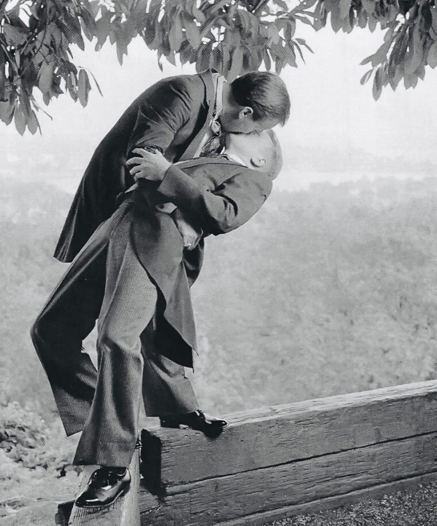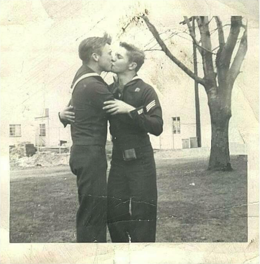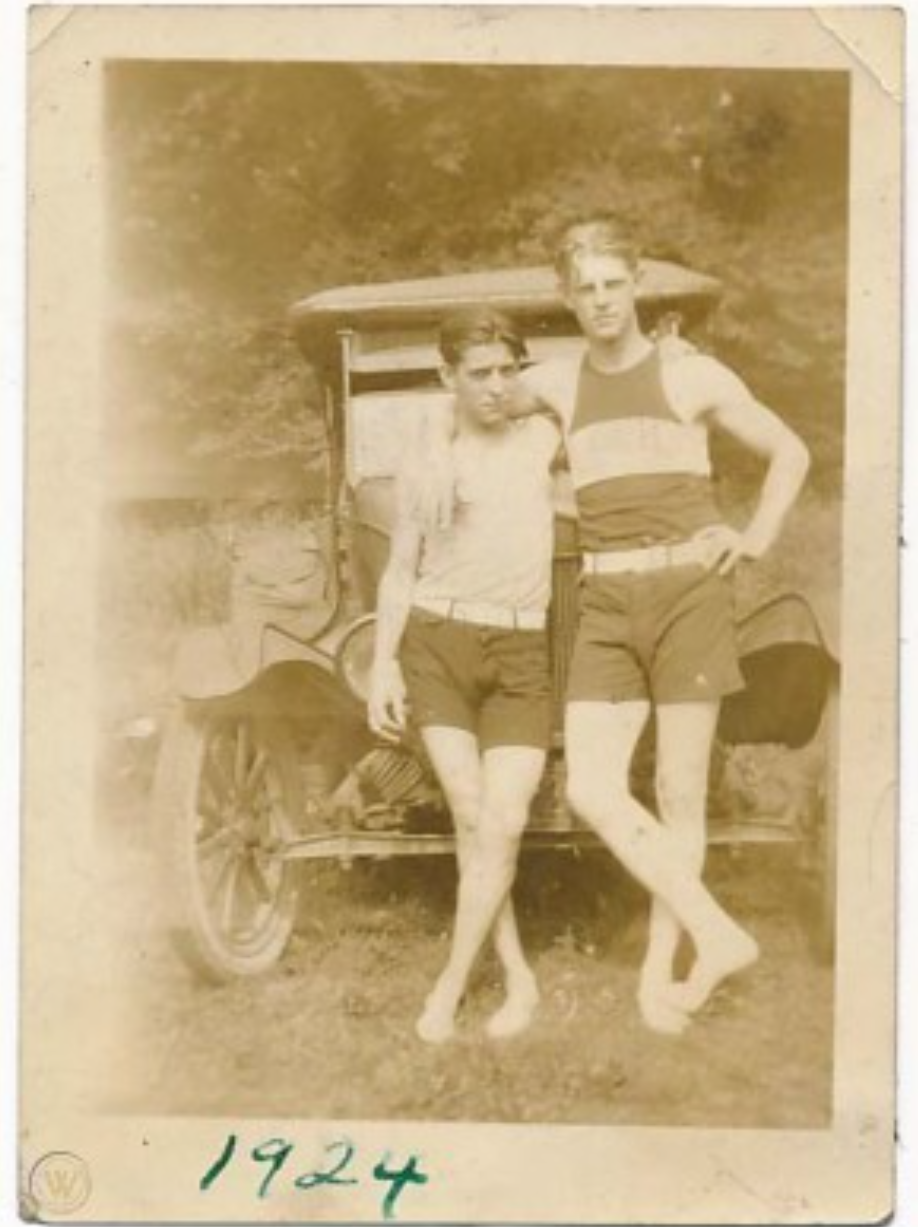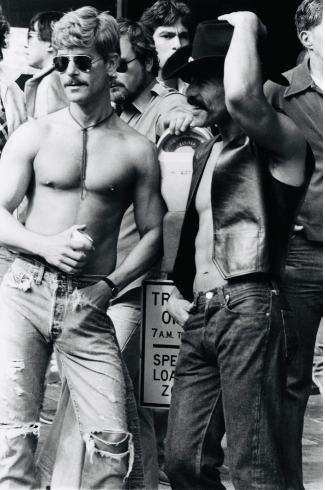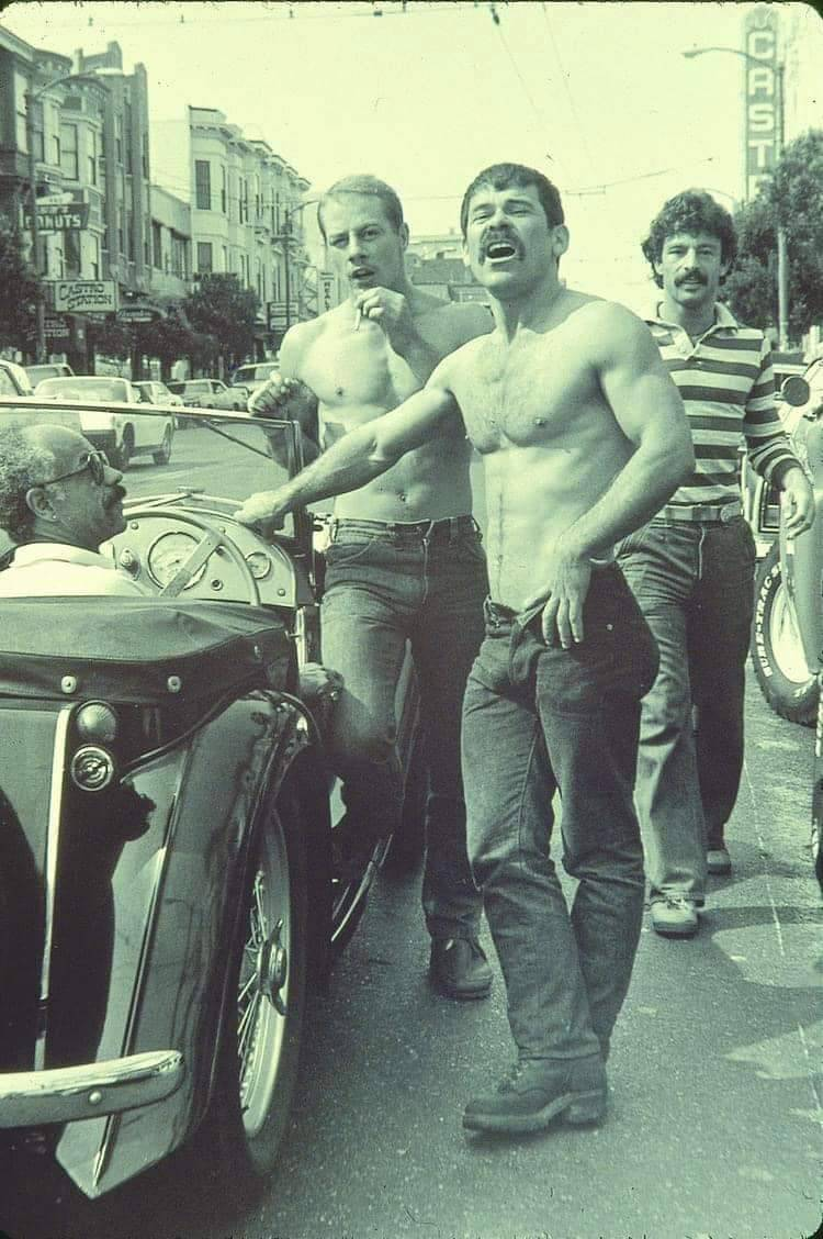 I’m very intrigued by this week’s vintage gay photo of guys at a gay bar (I’m guessing in the 1980s based on haircuts and clothing). I have no idea why the guy in the white t-shirt has miniature handcuffs clamped to his button fly and belt loop. I’m also more than a little curious to know who is the guy hidden behind him. Either way, these guys look like they are enjoying themselves.
